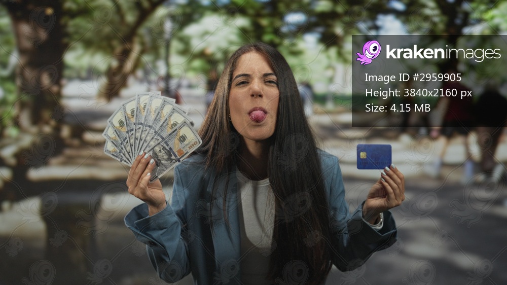 Young woman smiles holding fanned us dollars and a blue creditcard while standing on a tree lined street; confidence prosperity.