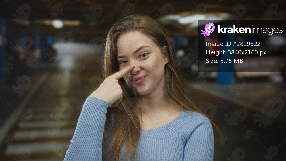 Young woman smiles next to a parked car inside a dimly lit building, head tilted slightly with blurred vehicles behind; joy.