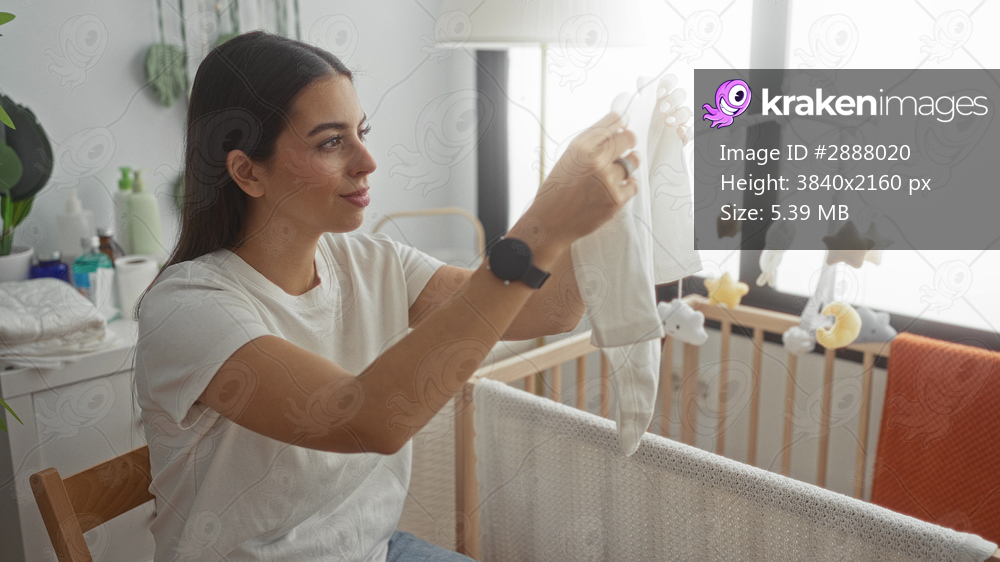 Young woman smiles while holding a baby onesie above a wooden crib near a hanging mobile in building bedroom; motherhood tenderness.