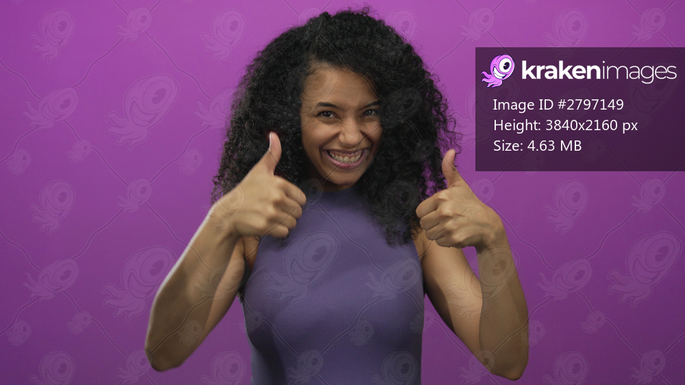 Young woman smiling against a vibrant purple background giving thumbs up with curly hair and wearing a sleeveless top portraying positivity and confidence - Kraken Images