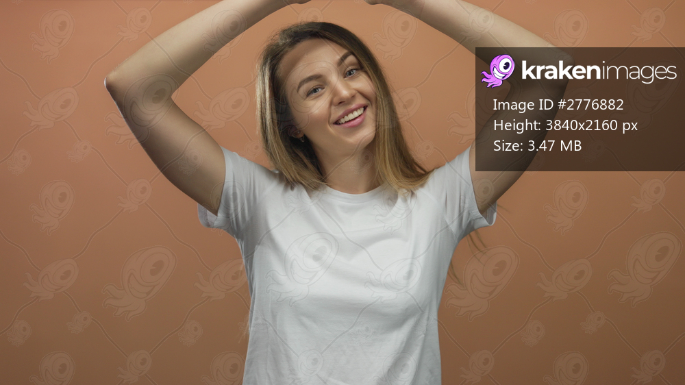 Young woman smiling against an isolated brown background with arms raised wearing a white shirt showcasing a joyful expression and relaxed demeanor