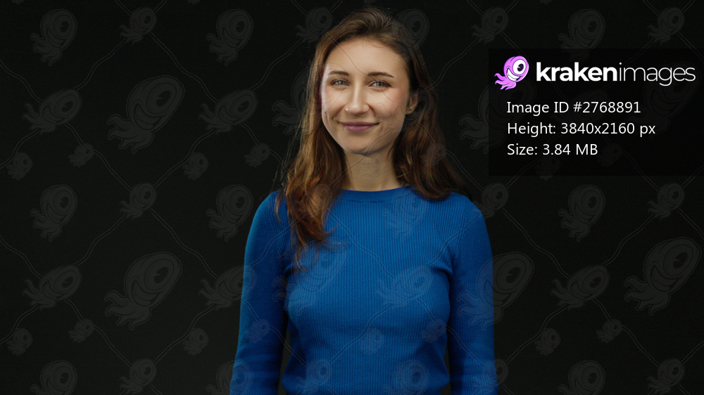 Young woman smiling against isolated black background embodying confidence and serenity in casual blue sweater with long hair