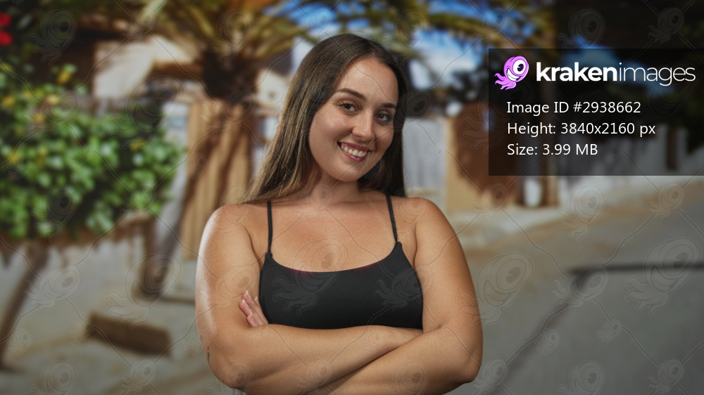 Young woman smiling with arms crossed showing bare shoulders at house on a residential street; confidence.