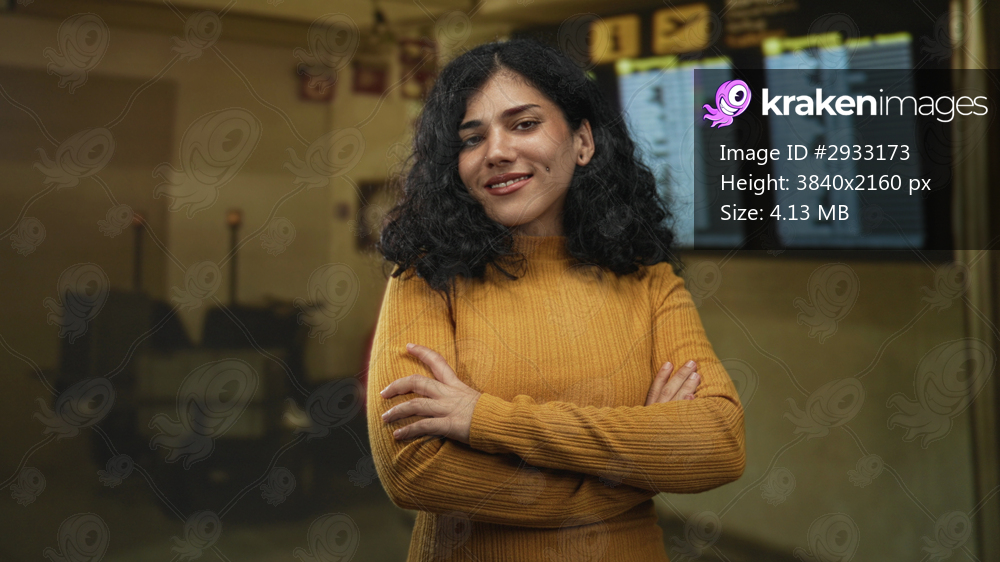 Young woman smiling with arms crossed wearing mustard sweater at airport terminal in front of departure board; confidence travel readiness.