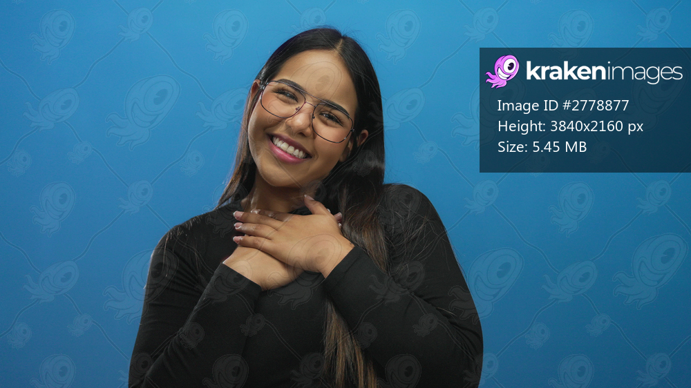 Young woman smiling with arms outstretched against a blue background, wearing glasses and a black top, embodying joy and openness in an isolated studio setting. - Kraken Images
