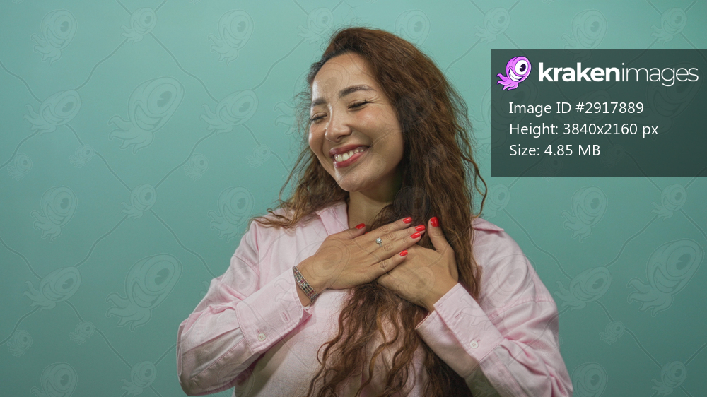 Young woman smiling with arms outstretched wearing pink shirt in mint green studio; joyful open embrace.