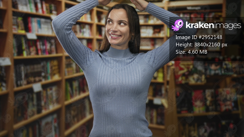 Young woman smiling with arms raised above head in a building aisle of books, hands framing face and shelves visible; curiosity discovery joy.