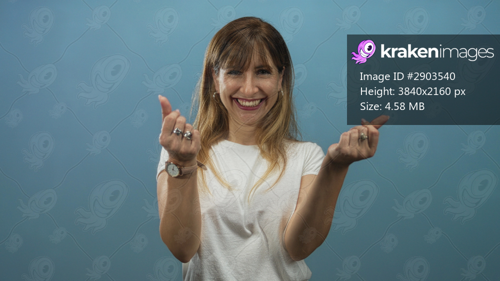 Young woman smiling and beckoning with pinched fingers in blue studio, wearing a white tshirt with visible watch and rings; joyful invitation.