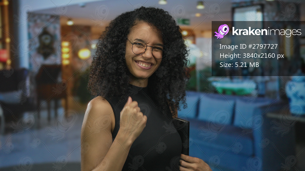 Young woman smiling beckons with hand while holding book in hotel lobby; invitation welcome hospitality warmth.