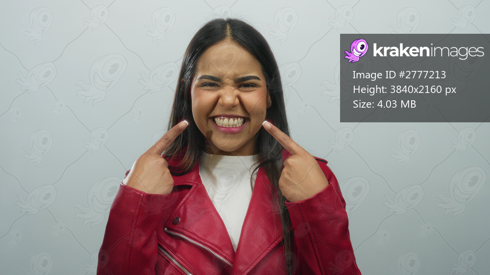 Young woman smiling broadly pointing at her happy face isolated on a white background wearing a red leather jacket expressing positivity and confidence. - Kraken Images