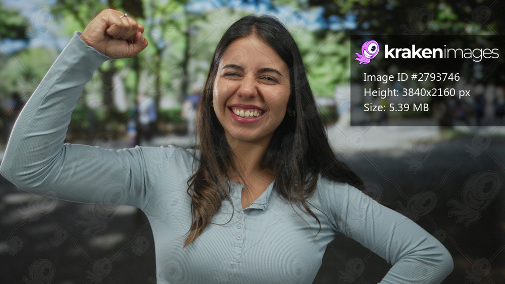 Young woman smiling confidently in a vibrant park setting with lush greenery, symbolizing joy and empowerment on a sunny day.