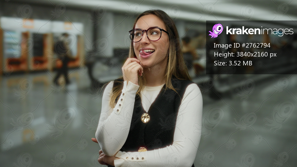 Young woman smiling confidently in an airport terminal with blurred travelers and modern interior creating a professional and lively atmosphere.