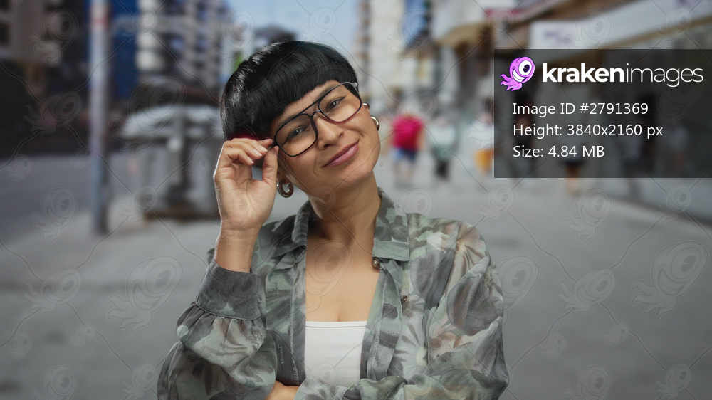 Young woman smiling confidently on urban street in vibrant city setting during daytime, expressing positivity and style with glasses and casual outfit. - Kraken Images