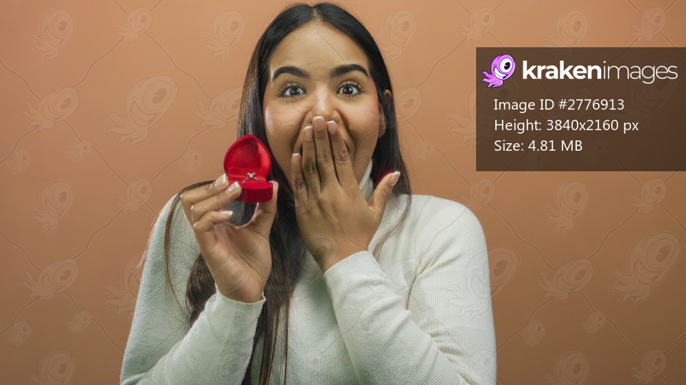 Young woman smiling and covering mouth holding engagement ring box with surprise against brown background