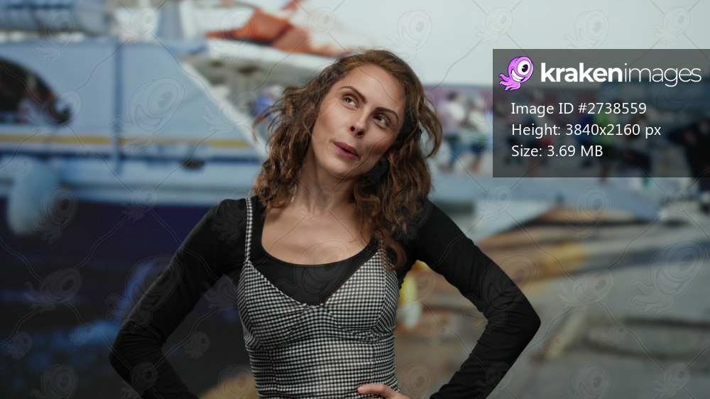 Young woman smiling and dancing happily at a lively seaside port with a yacht and blurred crowd in the background on a sunny day.