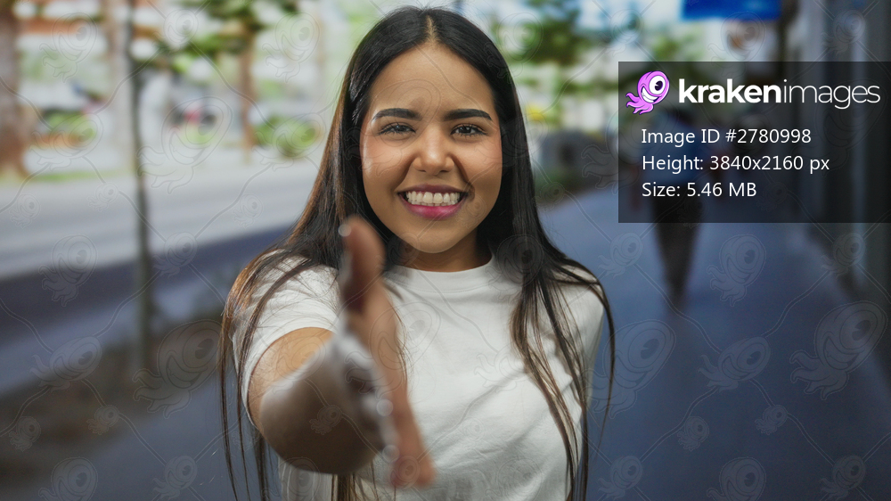 Young woman smiling extends hand on lively city street showing connection and friendliness in urban outdoor setting