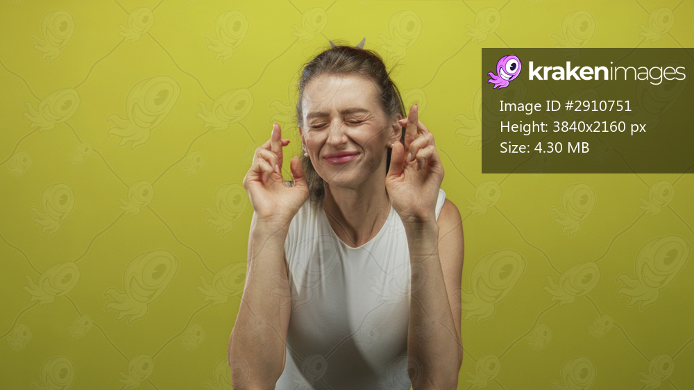 Young woman smiling with eyes closed crossing fingers near face in studio against yellow backdrop wearing white top; hope.