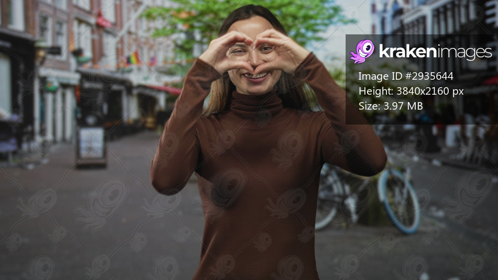 Young woman smiling with face visible and hands behind back on a cobbled city street lined with bicycles and cafes, wearing brown turtleneck; warm confidence. - Kraken Images
