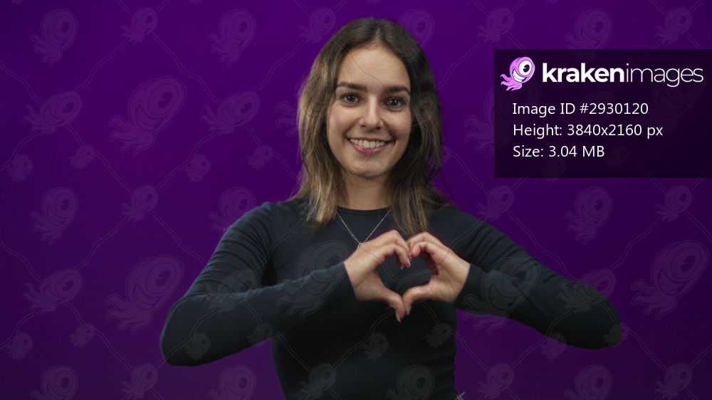 Young woman smiling and forming a heart with both hands in studio with deep purple backdrop; love kindness.