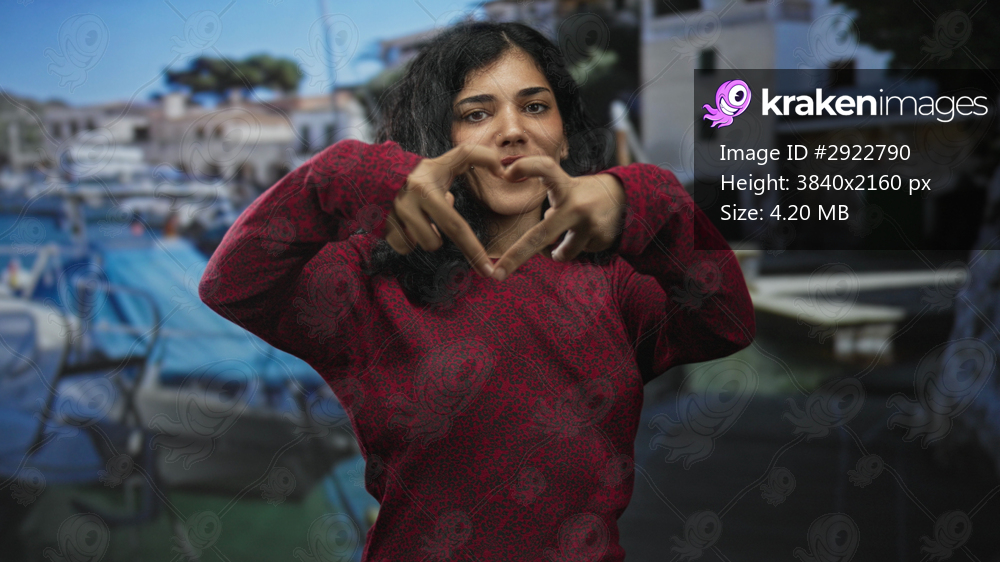 Young woman smiling forms a heart with her hands on a harbor street beside moored boats and a stone building; love joy.