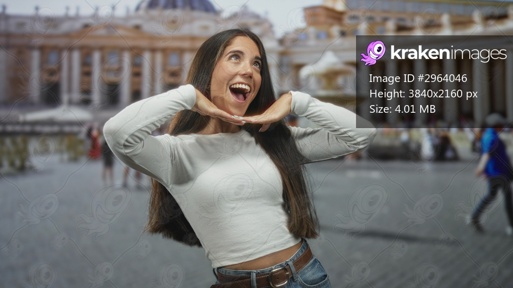 Young woman smiling and framing with fingers and hands at a street in front of colonnade and fountain; joyful confidence.