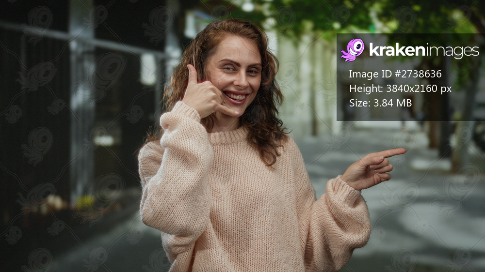 Young woman smiling and gesturing like calling in a city street wearing a cozy sweater, embodying cheerful urban vibes with a relaxed outdoor backdrop. - Kraken Images