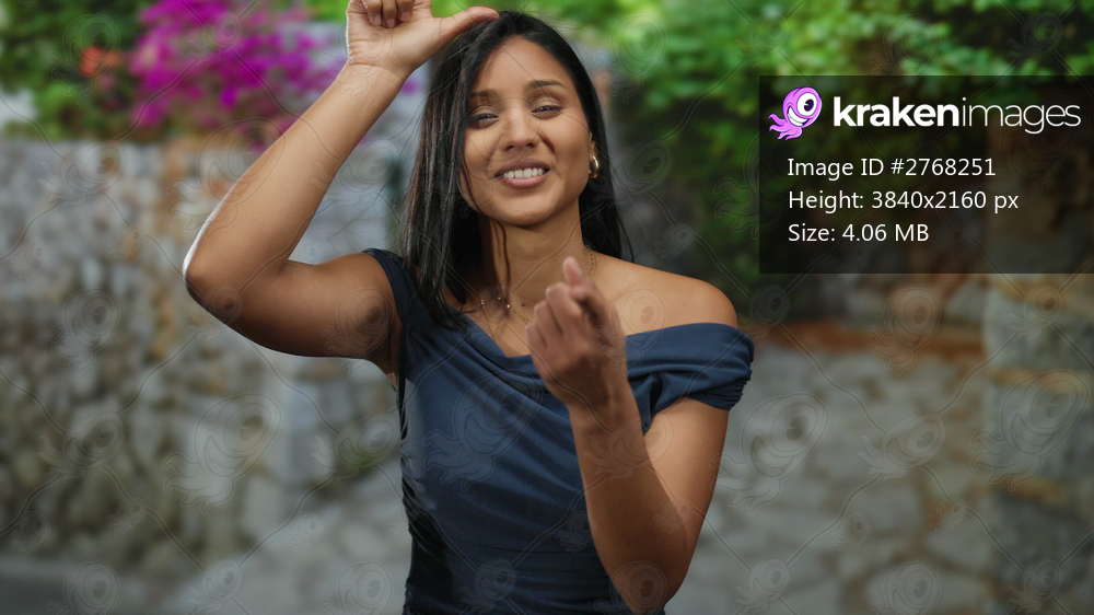 Young woman smiling and gesturing on a picturesque street with stone walls and vibrant greenery suggesting a lively outdoor environment.