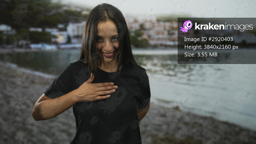 Young woman smiling with hand on chest at sandy beach shore with nearby buildings and calm sea; gratitude.
