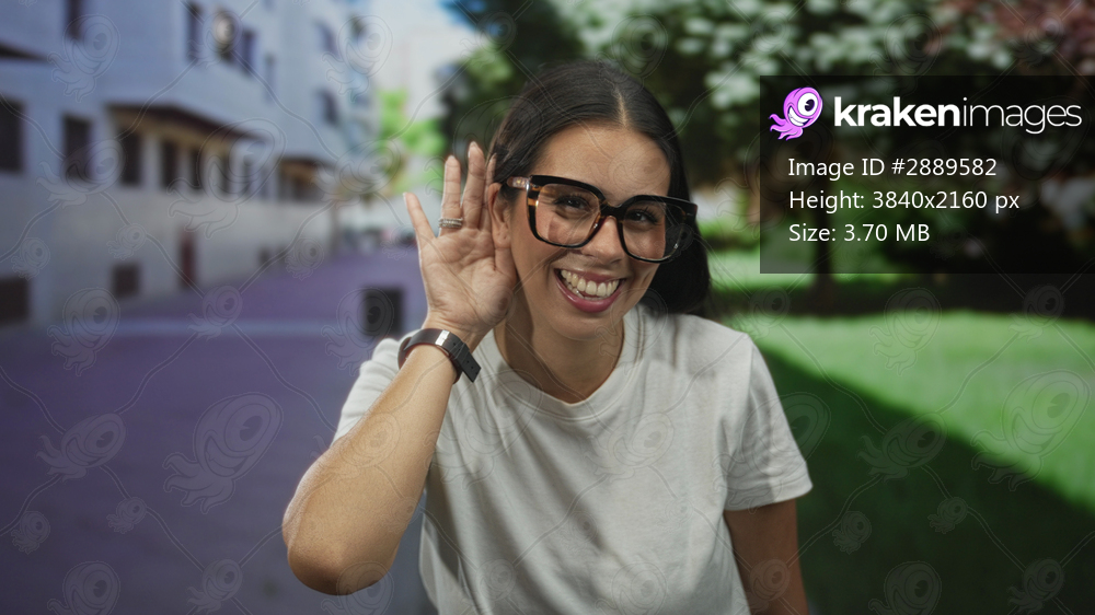 Young woman smiling with hand to ear and oversized glasses wearing white t shirt on urban street by building and trees; joy greeting.