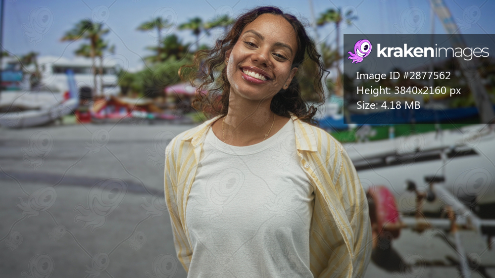 Young woman smiling with hands clasped on a street beside moored boats and a trailer, wearing white tee and yellow striped shirt; vacation joy warmth.