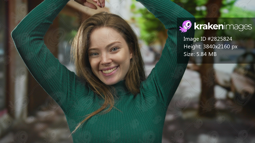 Young woman smiling with hands forming heart sign on city street at dusk in green sweater; love joy.