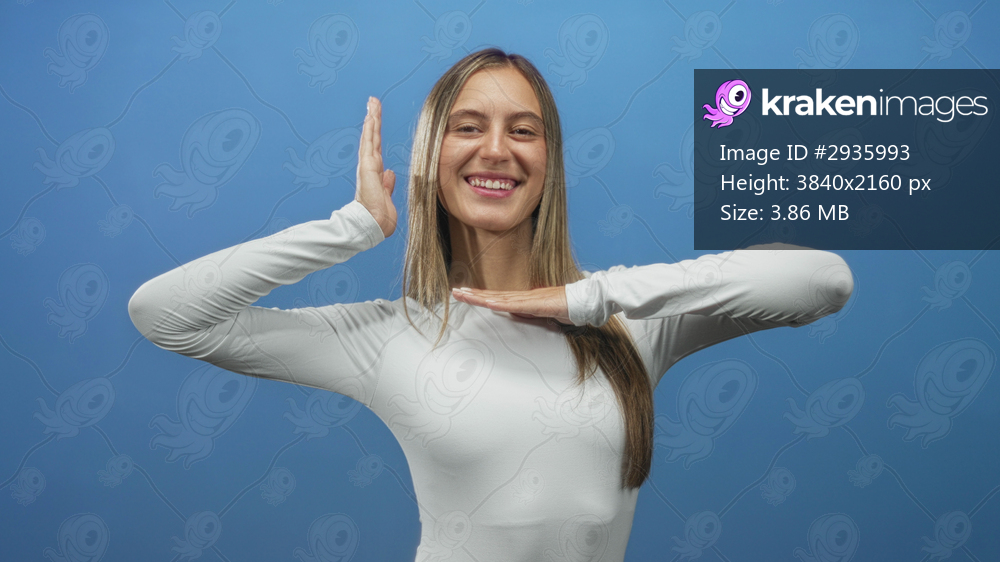 Young woman smiling with hands framing face and palms visible in a studio against a blue backdrop; playfulness.