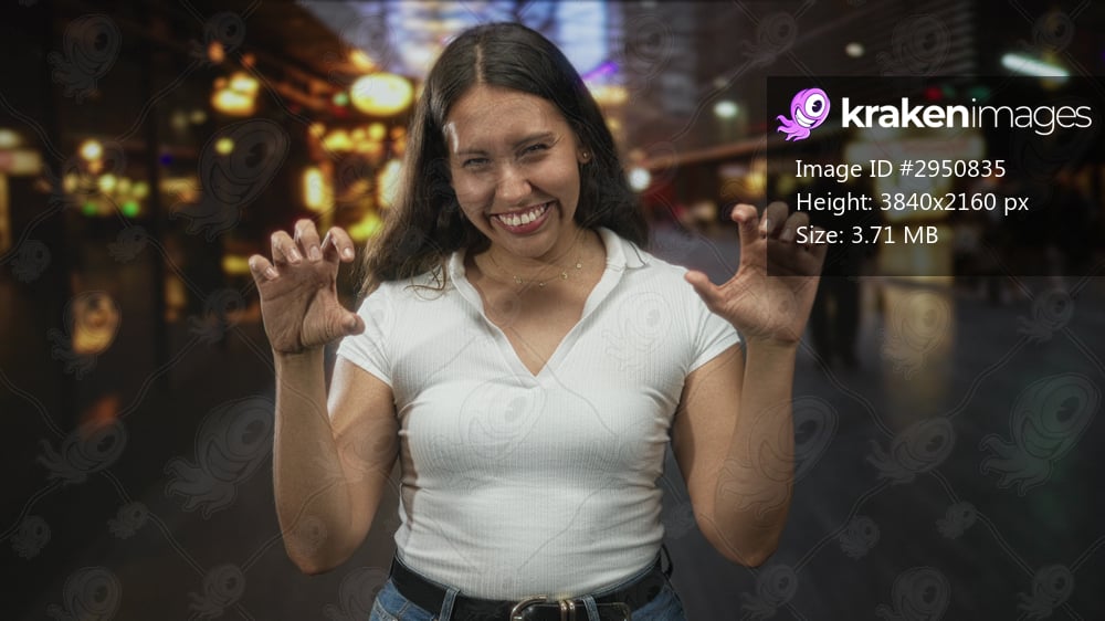 Young woman smiling with hands raised in claw gesture on a busy city street at night, wearing white top and jeans; playful joy.