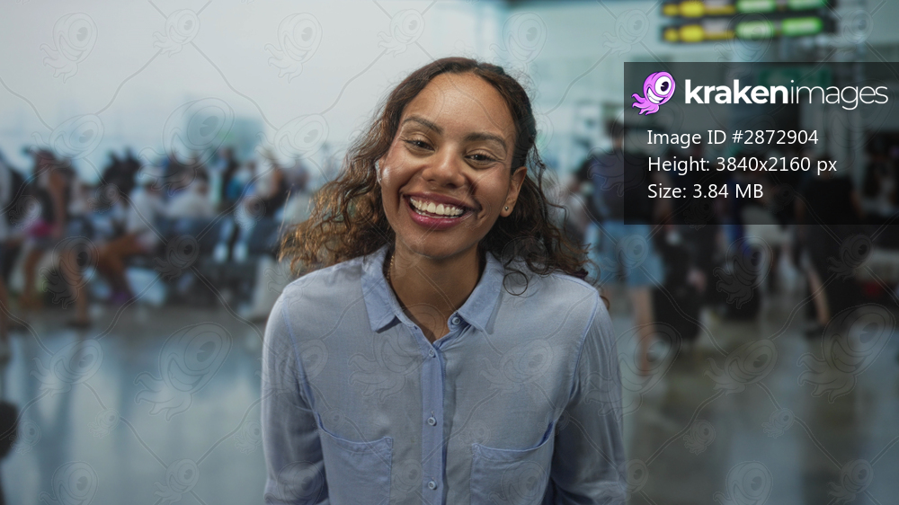 Young woman smiling with hands raised and palms visible in a busy airport terminal crowded with travelers and rolling suitcases; joyful travel.