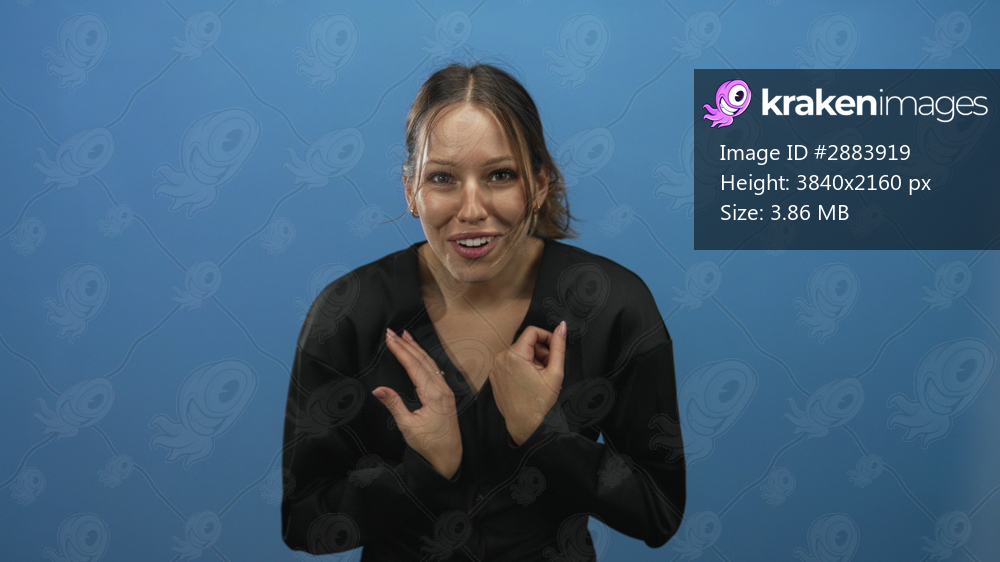 Young woman smiling with hands to chest wearing black top in blue studio under soft light with loose ponytail; joy triumph.