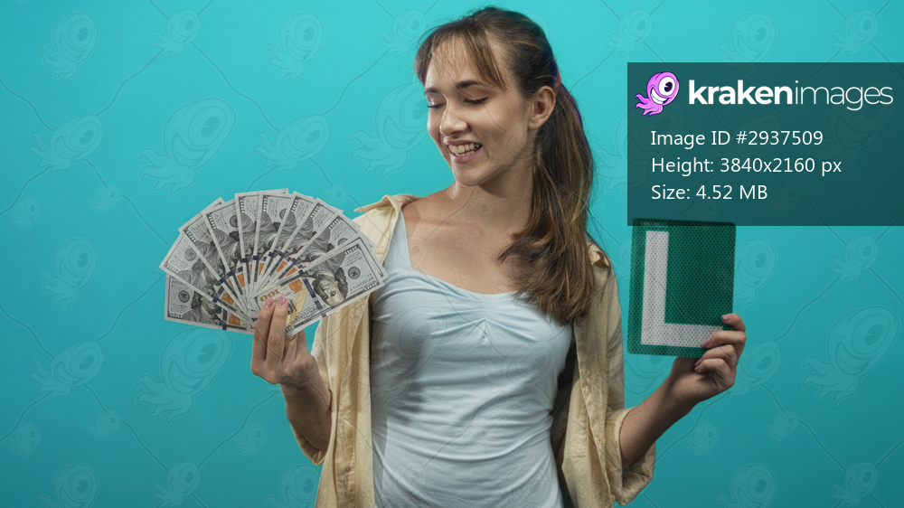 Young woman smiling and holding a fan of us dollar bills and a learner l plate in a turquoise studio; confidence.
