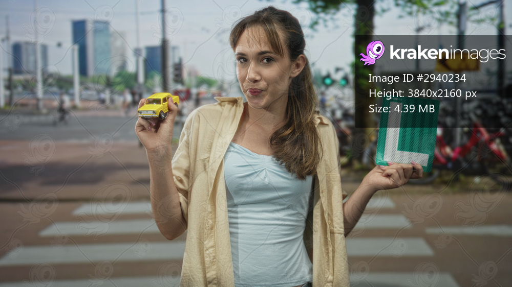 Young woman smiling, holding a yellow toy car and a learner plate at a city street crosswalk; learning independence confidence.
