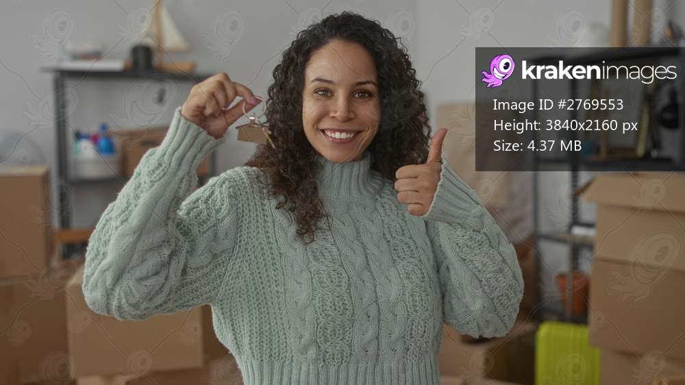 Young woman smiling holding keys in living room surrounded by boxes in her new home showing thumbs up joyful expression symbolizing a fresh start moving in. - Kraken Images