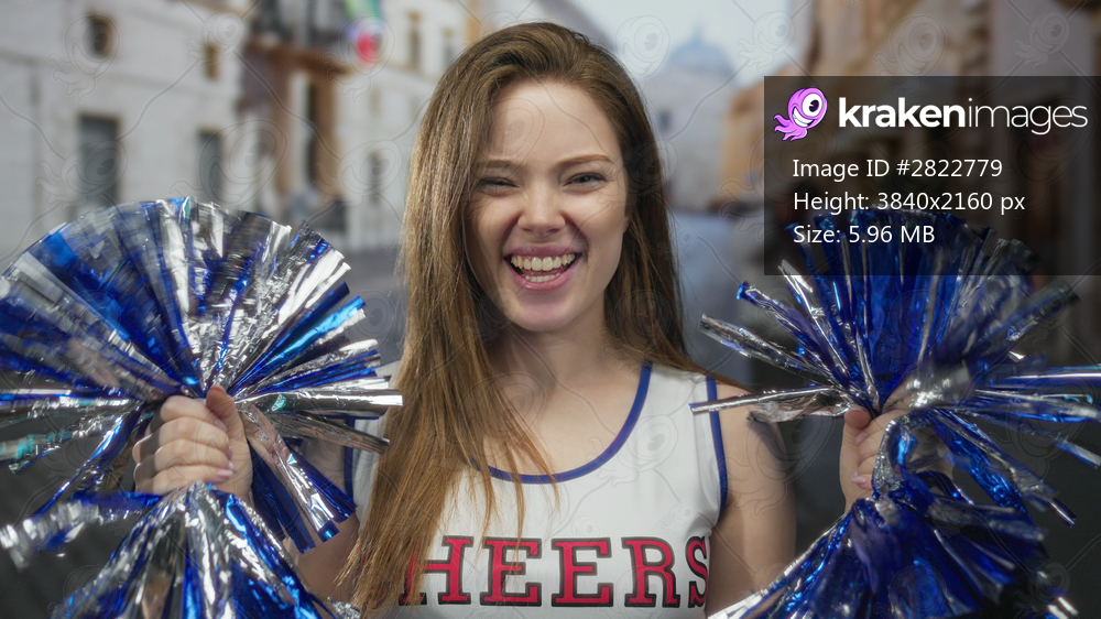 Young woman smiling and holding metallic blue pompom high in front of blurred city buildings on sunlit street; celebration joy.
