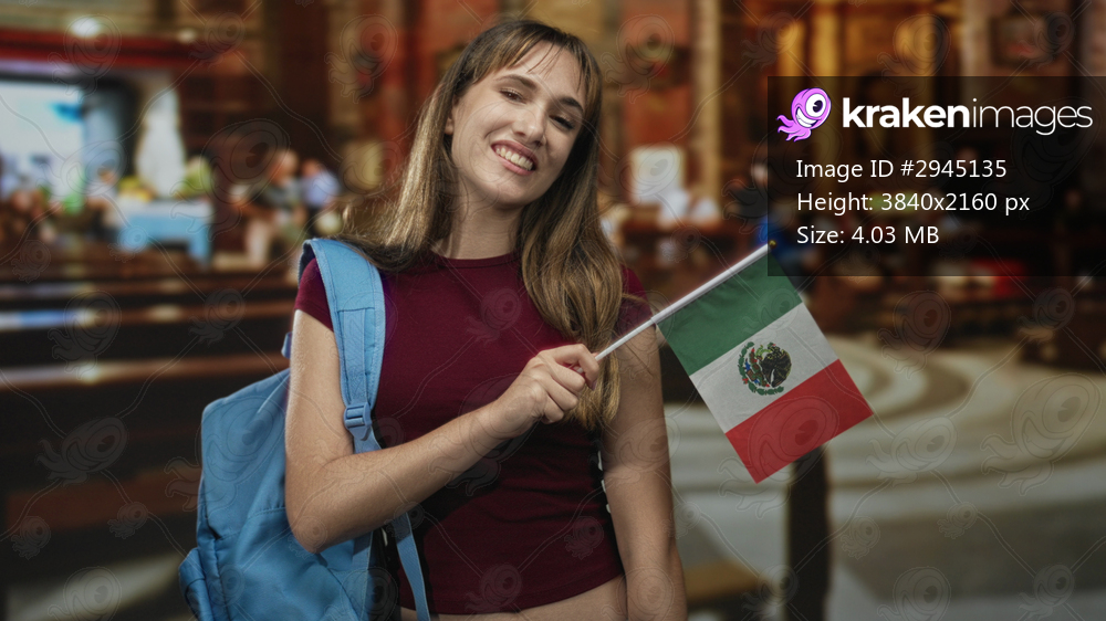 Young woman smiling and holding mexican flag with blue backpack on shoulder inside ornate church building near wooden pews and stained glass; pride faith celebration. - Kraken Images