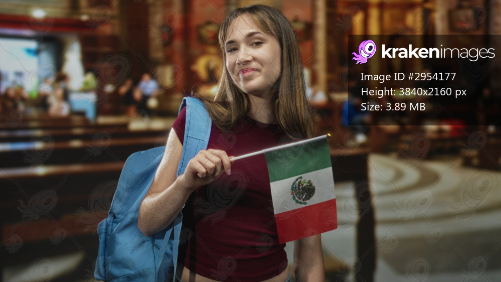 Young woman smiling and holding mexican flag with blue backpack on shoulder inside ornate church building near wooden pews and stained glass; pride faith celebration. - Kraken Images