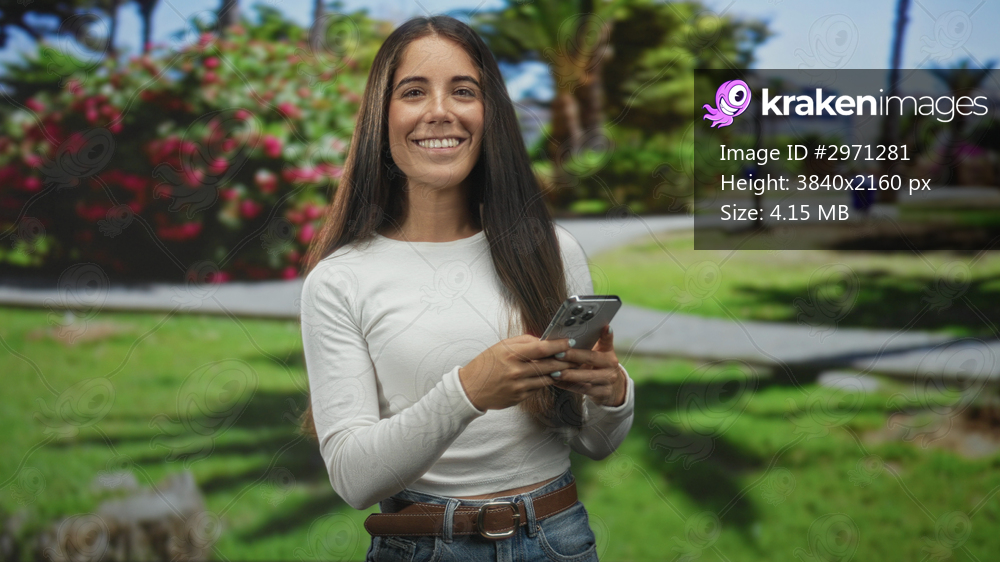 Young woman smiling and holding smartphone with hands visible on a street park path; serenity contentment.