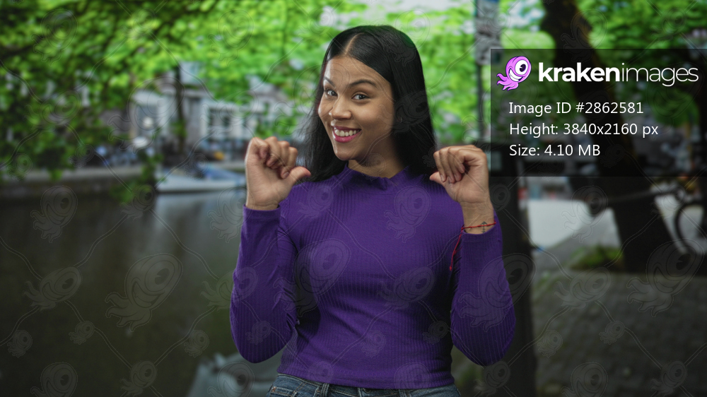 Young woman smiling holds fists raised in front of canal on cobblestone street; confidence strength.