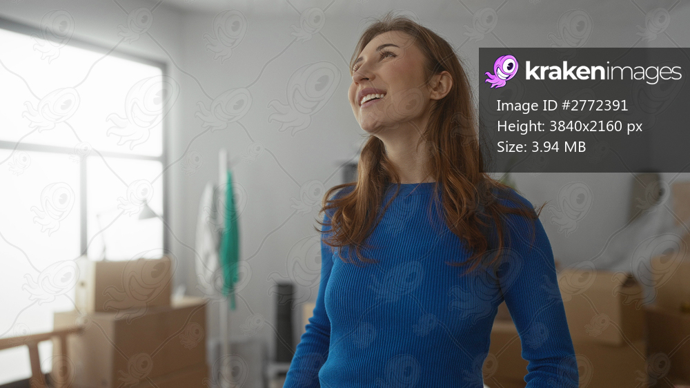 Young woman smiling in a bright new apartment with moving boxes around suggesting a fresh start in a new home and feeling content with her new living space. - Kraken Images