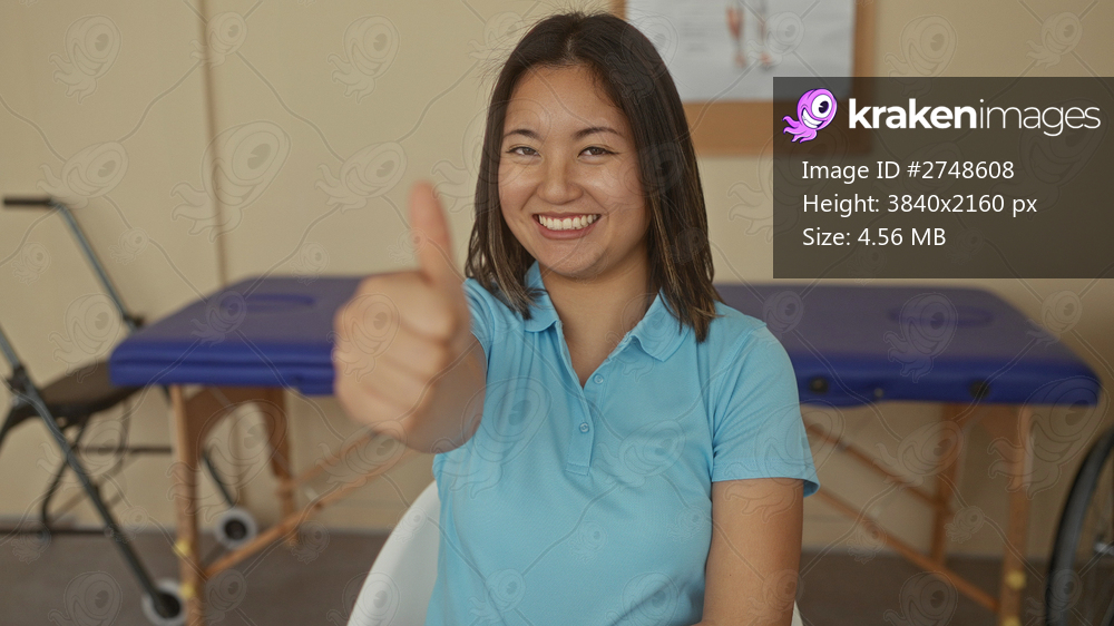 Young woman smiling in a clinic setting wearing a blue shirt, performing a thumbs-up gesture, signifying positivity in healthcare environment.
