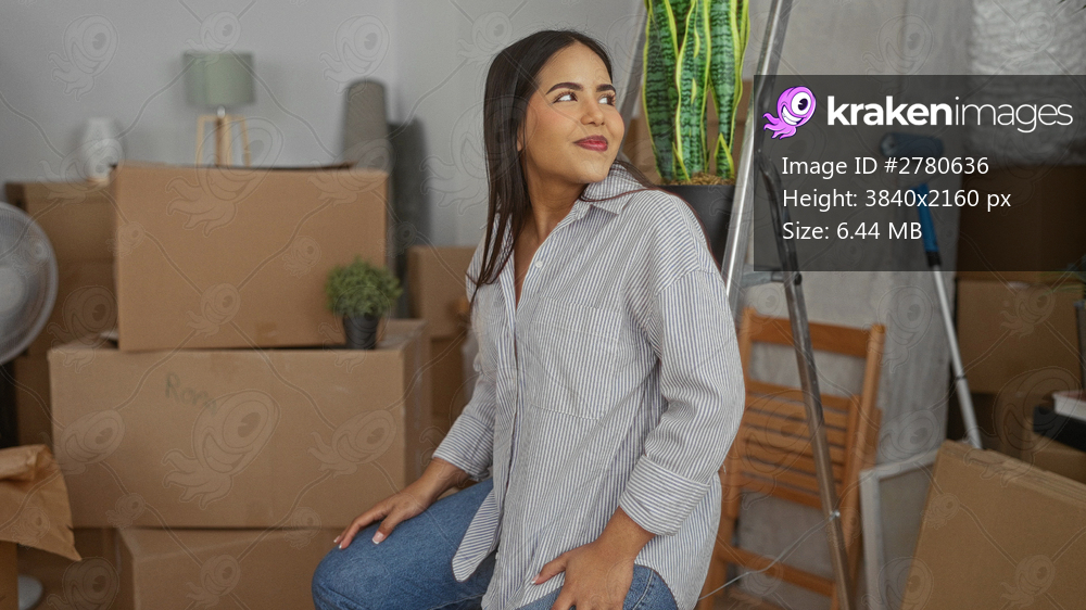 Young woman smiling in a new apartment with moving boxes, plants, and a ladder in the living room, conveying joy and fresh beginnings.
