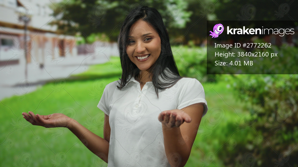 Young woman smiling in a park setting, showcasing an inviting and lively outdoor atmosphere with vibrant greenery under a clear sky.