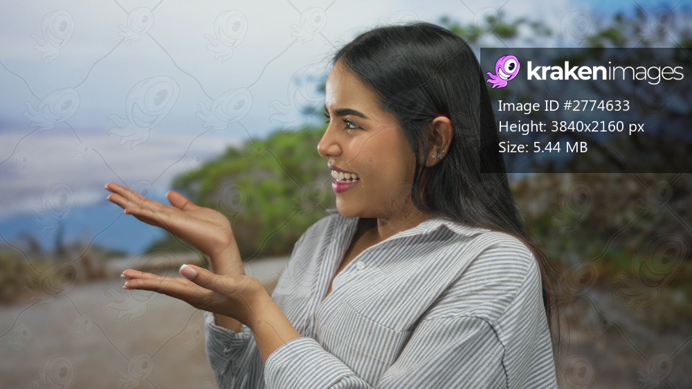 Young woman smiling in a scenic park with vibrant greenery, capturing a joyful moment outdoors with trees and blue sky in the background, showcasing natural and cheerful scenery. - Kraken Images