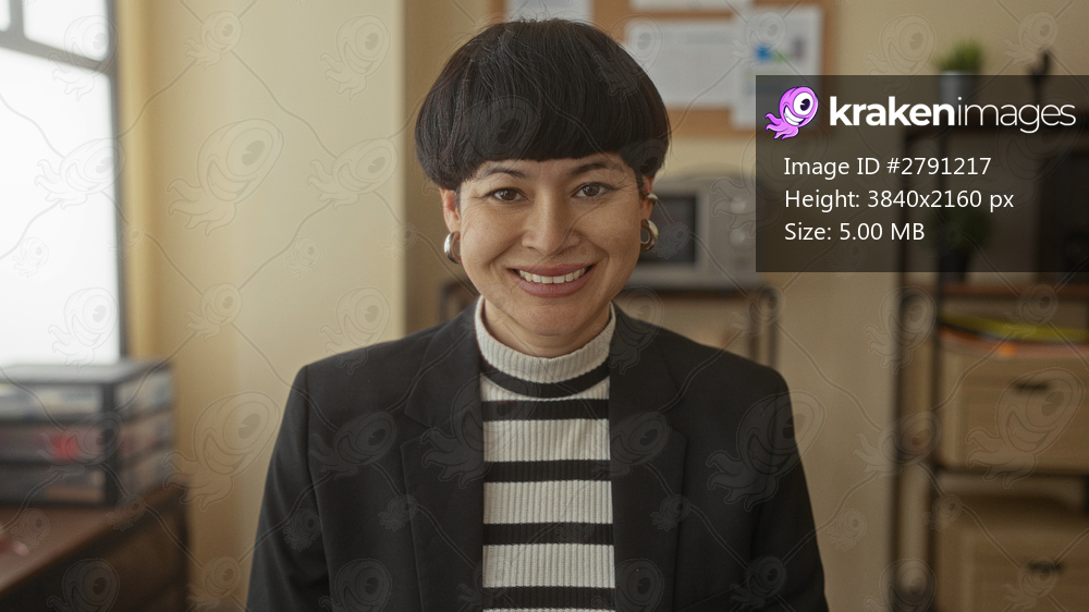 Young woman smiling in an office room wearing a blazer and striped shirt, showcasing a professional and cheerful workplace environment with office supplies visible on shelves. - Kraken Images