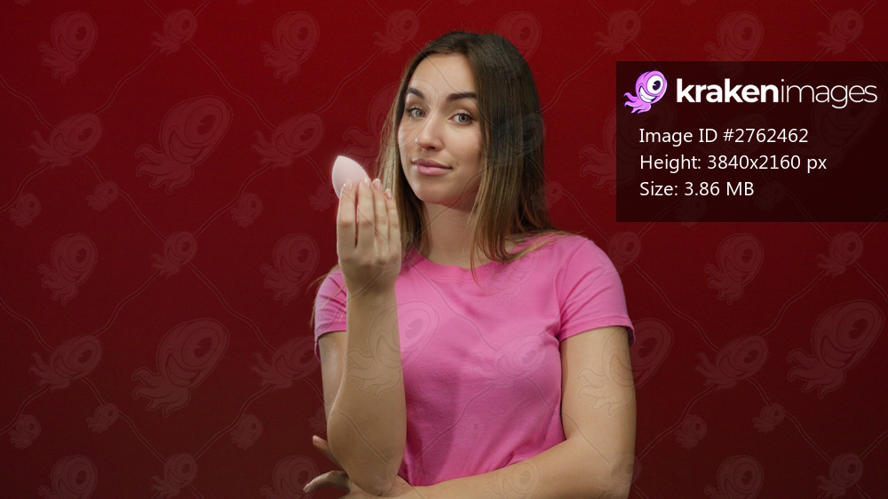 Young woman smiling in pink shirt holding makeup sponge against vibrant red wall background, embodying beauty and confidence.